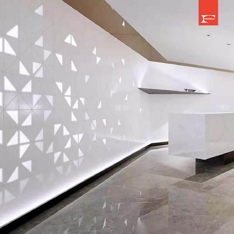 今天,就讓富美家?guī)阋黄饋硖剿魃愂癁檗k公空間帶去的精致與時尚吧......前臺接待處的背景墻采用鉆石切割造型,結(jié)合熱帶雨林的透光效果,富美家色麗石可以做到無縫拼接,精致又美觀,能夠給到來往賓客眼前一