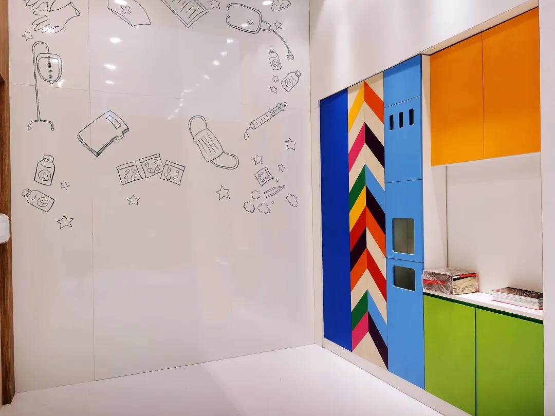 兒童病房涂鴉墻展區(qū)其實(shí)是富美家®磁性板的應(yīng)用區(qū)。兒童區(qū)病房的磁力板應(yīng)用,耐擦洗特性,適合投影、書寫,涂鴉,還可吸附磁性裝飾,即使是醫(yī)療區(qū)域一隅,同樣需要增添活潑生動(dòng)、有趣溫情的空間氛圍。